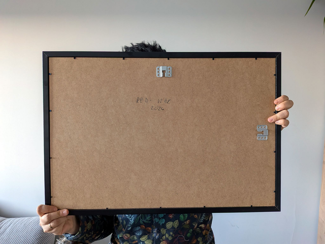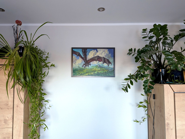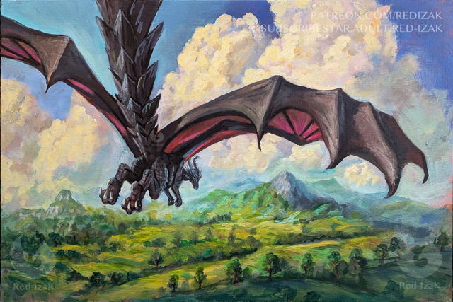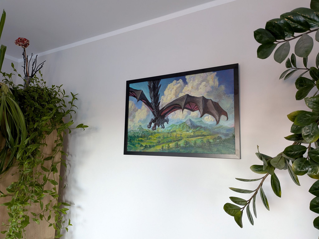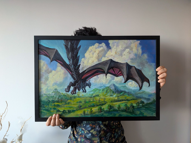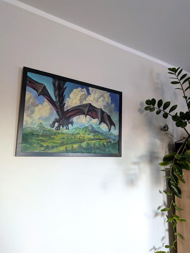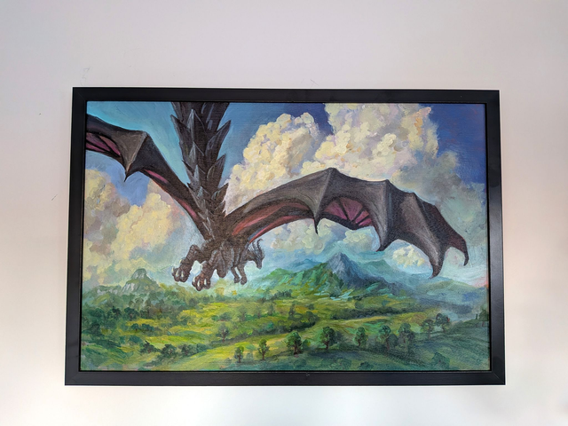 Painting of a black dragon flying towards a mountain. Acrylic on canvas panel. Framed in black frame.