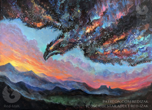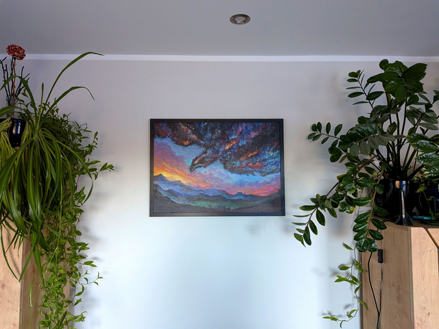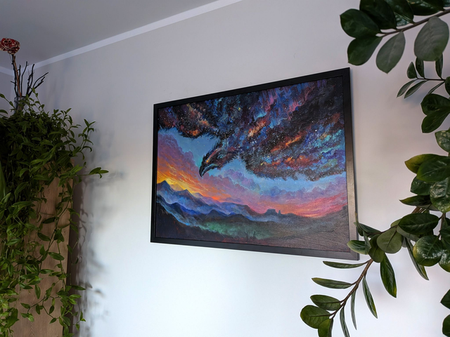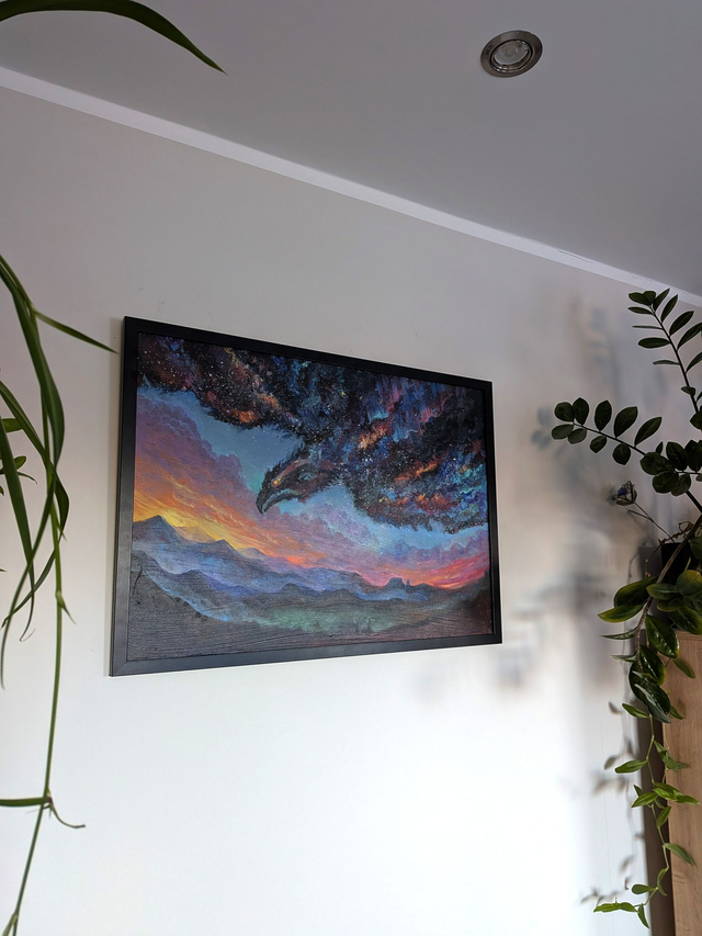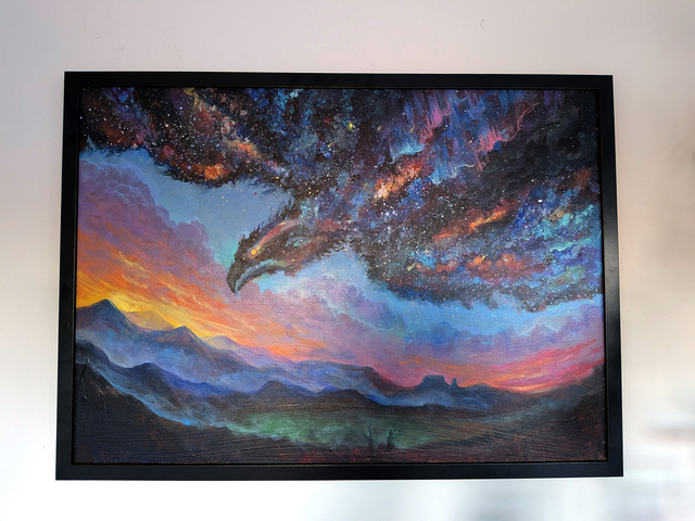Painting of a celestial bird in the sky. Framed in black frame. Acrylic on canvas panel